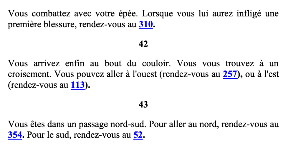 Les livres interactifs ne sont pas aussi récents que la page wikipédia le prétend. Mes recherches remontent au début du XX°siècle pour trouver un ancêtre aux Défis Fantastiques, et autres productions ultérieures. Entre les deux périodes, peu d’ouvrages ont retenu l’attention. Ils sont découpés en paragraphes numérotés vous renvoyant vers un numéro précis sans suivre l’ordre croissant habituel. Commençant au paragraphe 1, la suite peut vous invitez au milieu du livre comme quelques pages plus loin, en fonction des choix pour lesquels vous opterez.